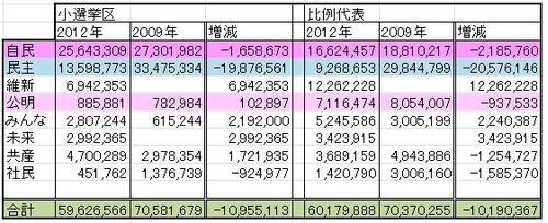 今回の衆院選は、自民党の圧勝・政権奪回となりました。一体どのくらいの票が自民に流れるとこんな大転換になるのかと思い、前回、2009年の選挙と得票数を比べてみました。*1今回、自民党の得票数は減っています。2009年、政権から転落した時よりも更にざっ…